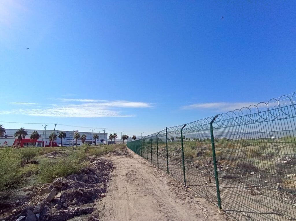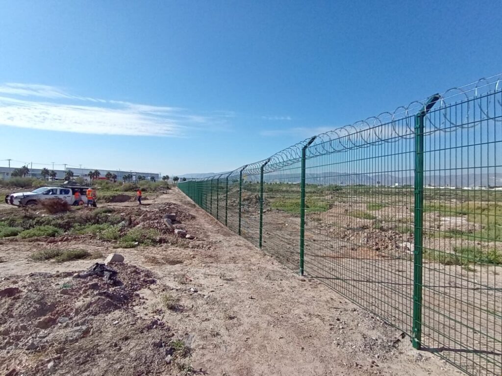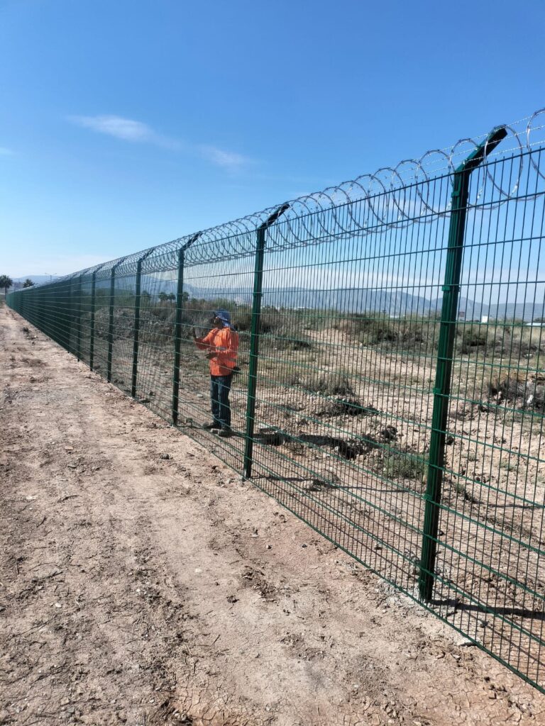 - Tres líneas de púas y concertina en la parte superior, reforzando la protección perimetral.